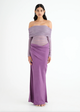 The Yasmin Maxi Dress features a beautiful off-shoulder design with a flattering cowl on the wearers left side waist. The overlapping skirt adds a touch of sophistication while the mesh bodice. Perfect for any special occasion.