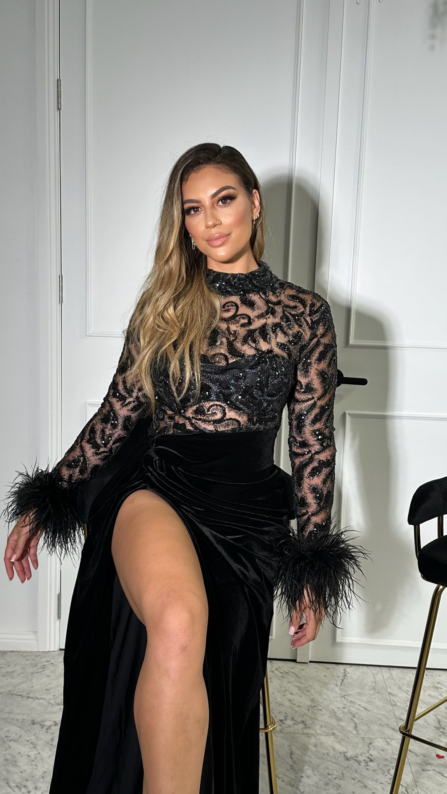 Made from a premium stretch-velvet fabric for skirt part with high slit