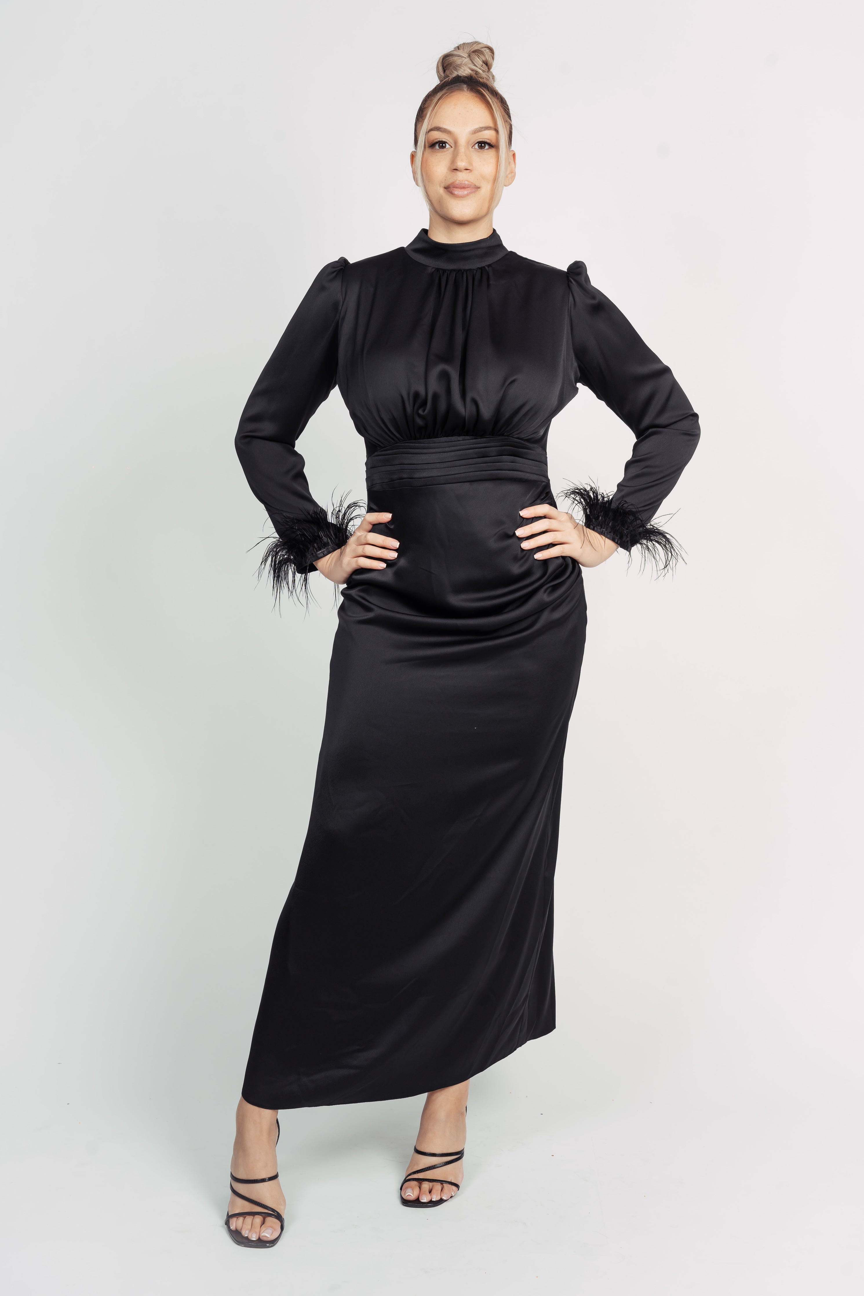 The Amanda gown offers a luxurious and lustrous feel that drapes beautifully, while the feathers on the sleeves adds a captivating and intricate detail.