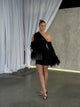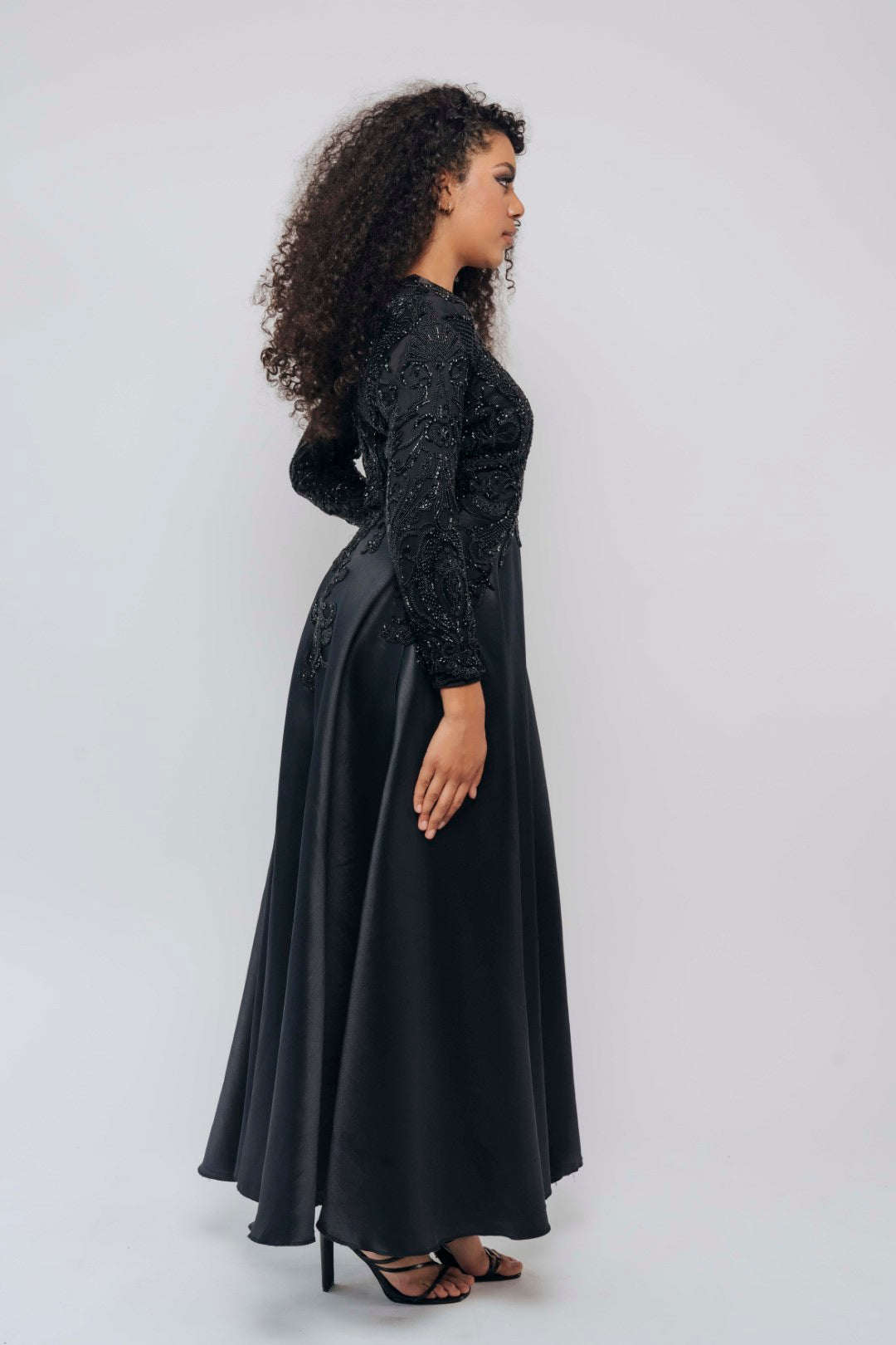 the Chicago gown offers a luxurious and lustrous feel that drapes beautifully. The black color adds a touch of timeless glamour, while the intricate embroidery on the bodice adds a captivating and intricate detail.