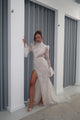 Stand out in the crowd wearing the strapless Willona Dress. Hand embellished made up of glamorous beads and large sequence across the entire silhouette. Complemented by a high split featuring a corset style waist.