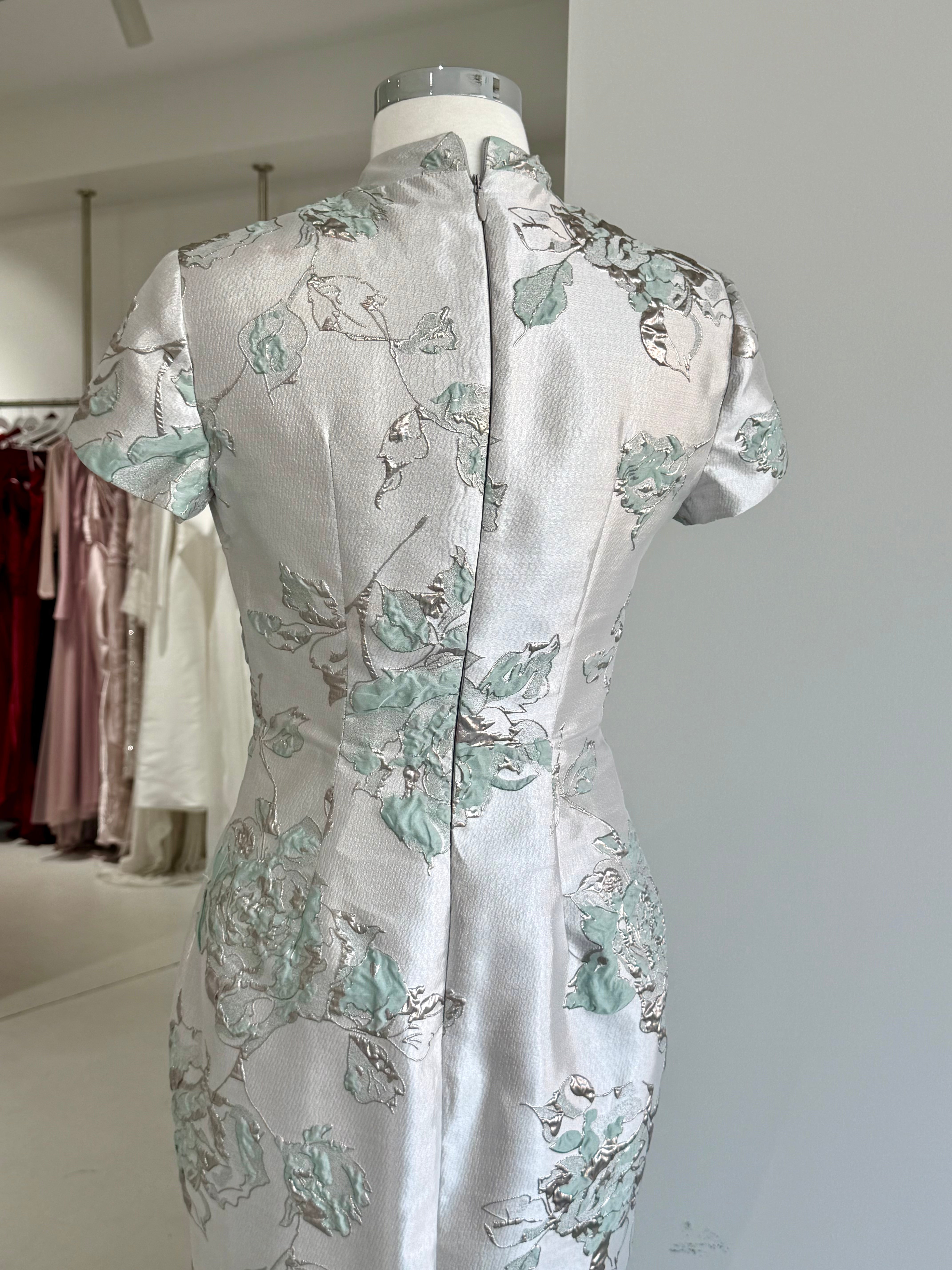 Graceful, refined, and timeless — the brocade gown is a tribute to traditional Vietnamese elegance reimagined for the modern woman. Crafted from lustrous brocade silk with soft jade floral embroidery, this high-collar silhouette flatters the figure with structured tailoring and classic charm. Short sleeves and a floor-length finish make it perfect for engagement ceremonies, tea parties, or elegant soirées.