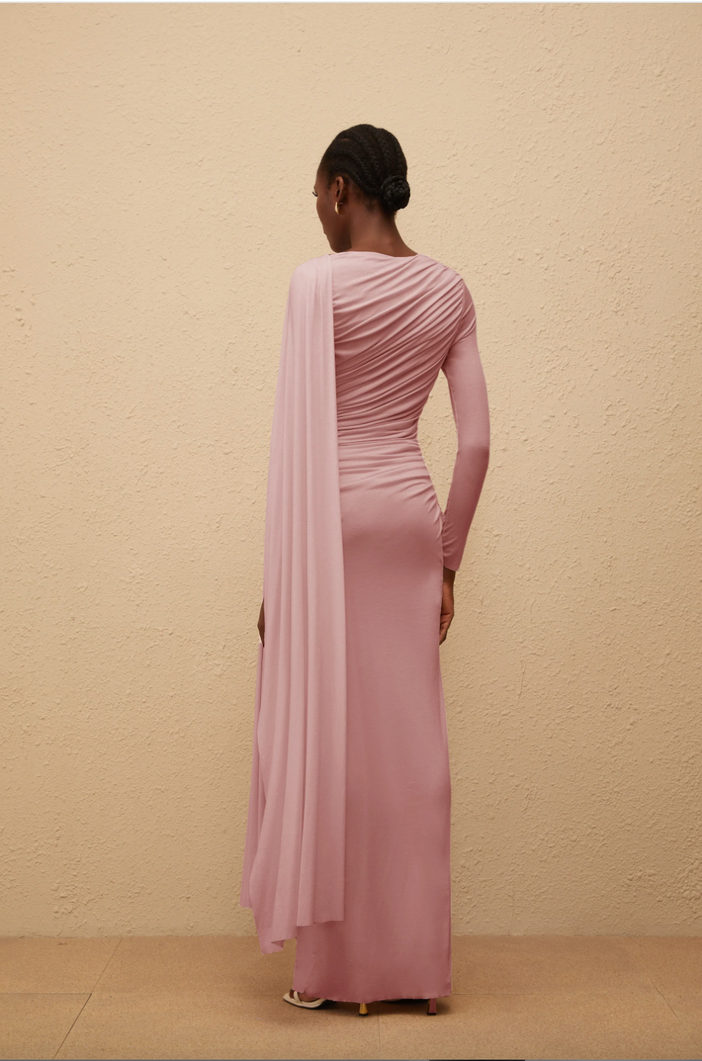 Elevate your next event with the Paloma Pink Asymmetrical Ruched Knit Maxi Dress — a delicate balance of feminine softness and modern structure. The rich rose-pink hue is rendered in a sumptuous knit that feels both sculpting and breathable, while the asymmetrical neckline and sleek long sleeves introduce an unexpected edge. Ruched detailing cinches the waist and flows into a streamlined maxi skirt that elongates the figure with understated elegance. Finished with ribbon-design accents and subtle hardware, this piece transitions effortlessly from twilight cocktails to after-party glamour.