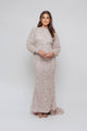 This elegant dress features a flattering silhouette that gracefully flows to the floor. The delicate embroidery adds a touch of detail without overwhelming the simplicity of the design.