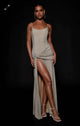 The MARCEL is a fitted maxi dress with a straight skirt and long sleeves. The off-shoulder neckline pairs perfectly with the fabric overlay over the bust, while the long sleeves have been designed to cinch to your arms before transitioning into flared hems around the wrist and palm. Adorned with rhinestones, Marcel's stretchable material promises both comfort and shimmer.