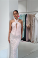 Crafted from luxurious macchiato silk, this strapless pink dress is a modern masterpiece of structure and sophistication. The boned corset-style bodice offers sculpted support and a flattering silhouette, while the soft sheen of the silk adds an elegant touch. At the hips, pleated diagonal detailing creates dynamic shape and movement, adding a unique twist to the classic hourglass form. Perfect for special occasions, evening events, or statement moments, this dress blends contemporary design with timeless femininity.