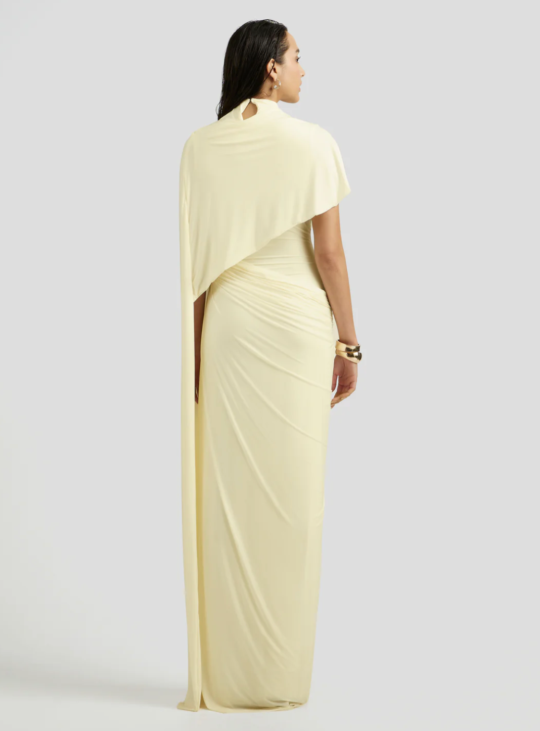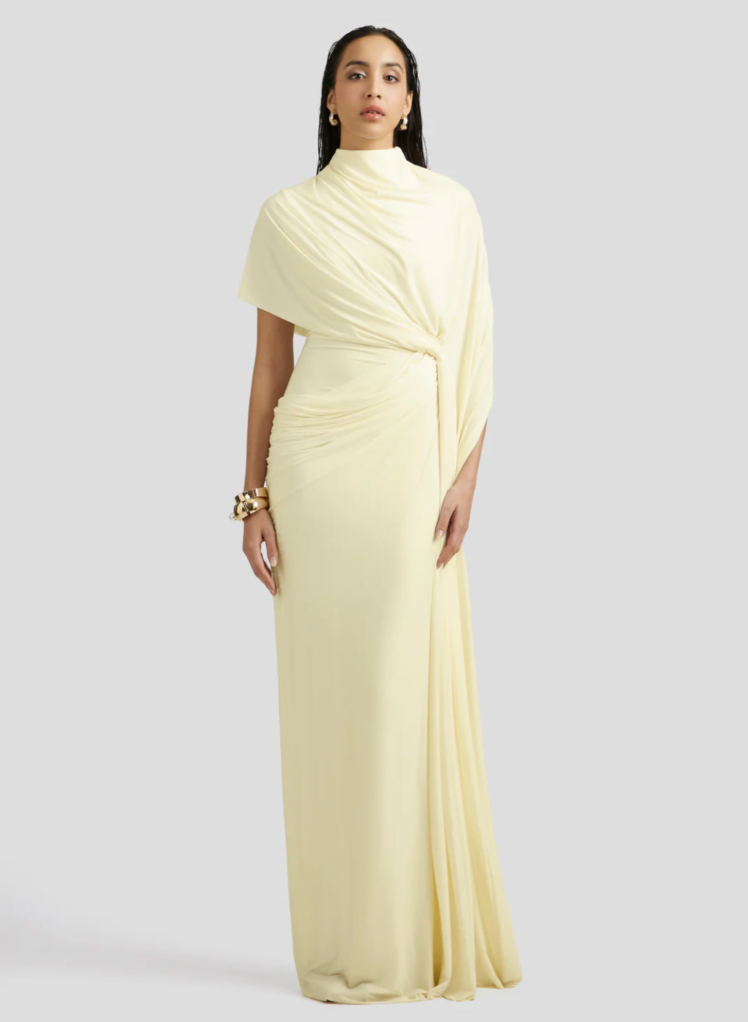 The LUCIANA lycra gown features a fitted body that highlights the natural silhouette, with a cowl detail at the low waist adding texture and interest. An asymmetrical cape-like drape extends from the design, creating a sense of flow and movement. The soft and stretchy fabric ensures a comfortable fit while maintaining a sleek appearance. The combination of the fitted body, low-waist cowl, and flowing cape detail offers a balanced and unique design.