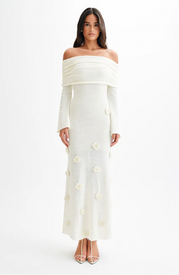The KIKI Off Shoulder Knit Rose Maxi Dress exudes timeless sophistication. With an off-shoulder neckline and long sleeves, this bodycon dress beautifully contours the silhouette. The delicate flower applique adds a touch of romance, while the lightweight knit fabrication ensures a comfortable fit. Designed in a maxi length, this is a refined choice for your next rendezvous.