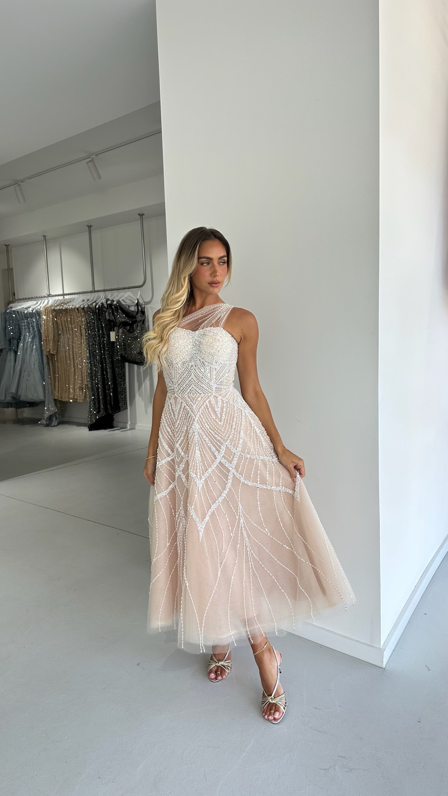 The Winx dress is a delicate blend of elegance and charm. Featuring a soft nude lining, this A-line midi dress is beautifully overlaid with a white beaded tulle layer, creating an ethereal, shimmering effect. The flowing silhouette offers a timeless and graceful look, perfect for those who love understated glamour. Whether for a special occasion or an elegant soirée, the Winx dress is the perfect choice for effortless sophistication. Rent the Winx dress and embrace its dreamy, romantic allure.