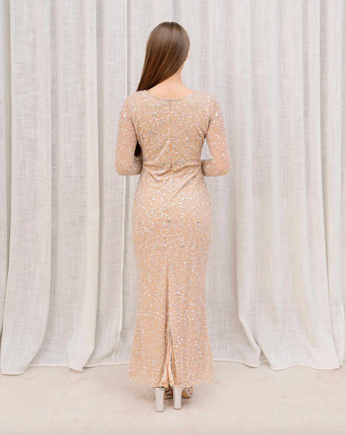 A stand out silhouette, that boasts in Maldina signature detailing, The Emma Gown features a slim fitting silhouette, a stone cluster and complete with a faltering raised round neckline falling to a mid length gown.