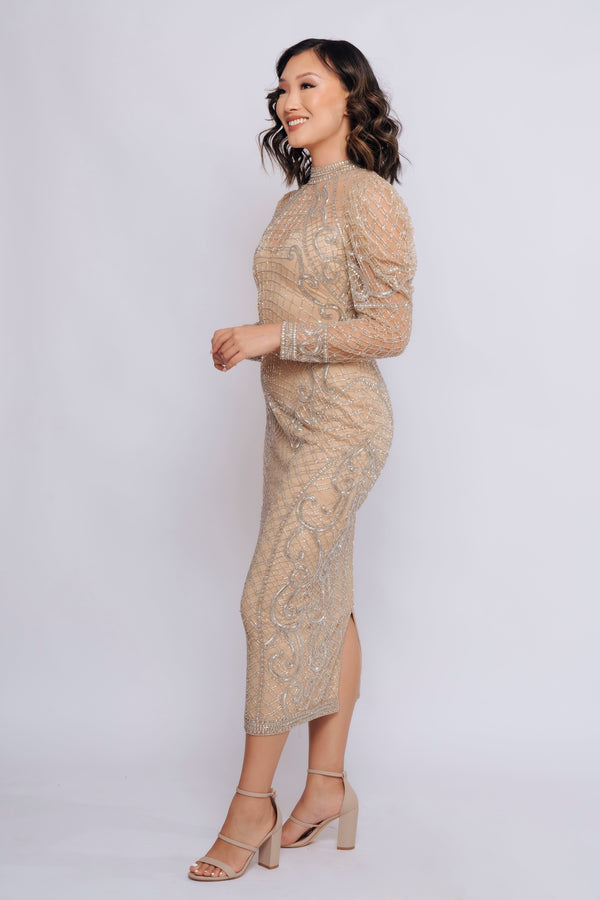 The ankle-length design adds a touch of glamour, while the bead embellishment on the dress add a mesmerizing sparkle that catches the light with every step you take.