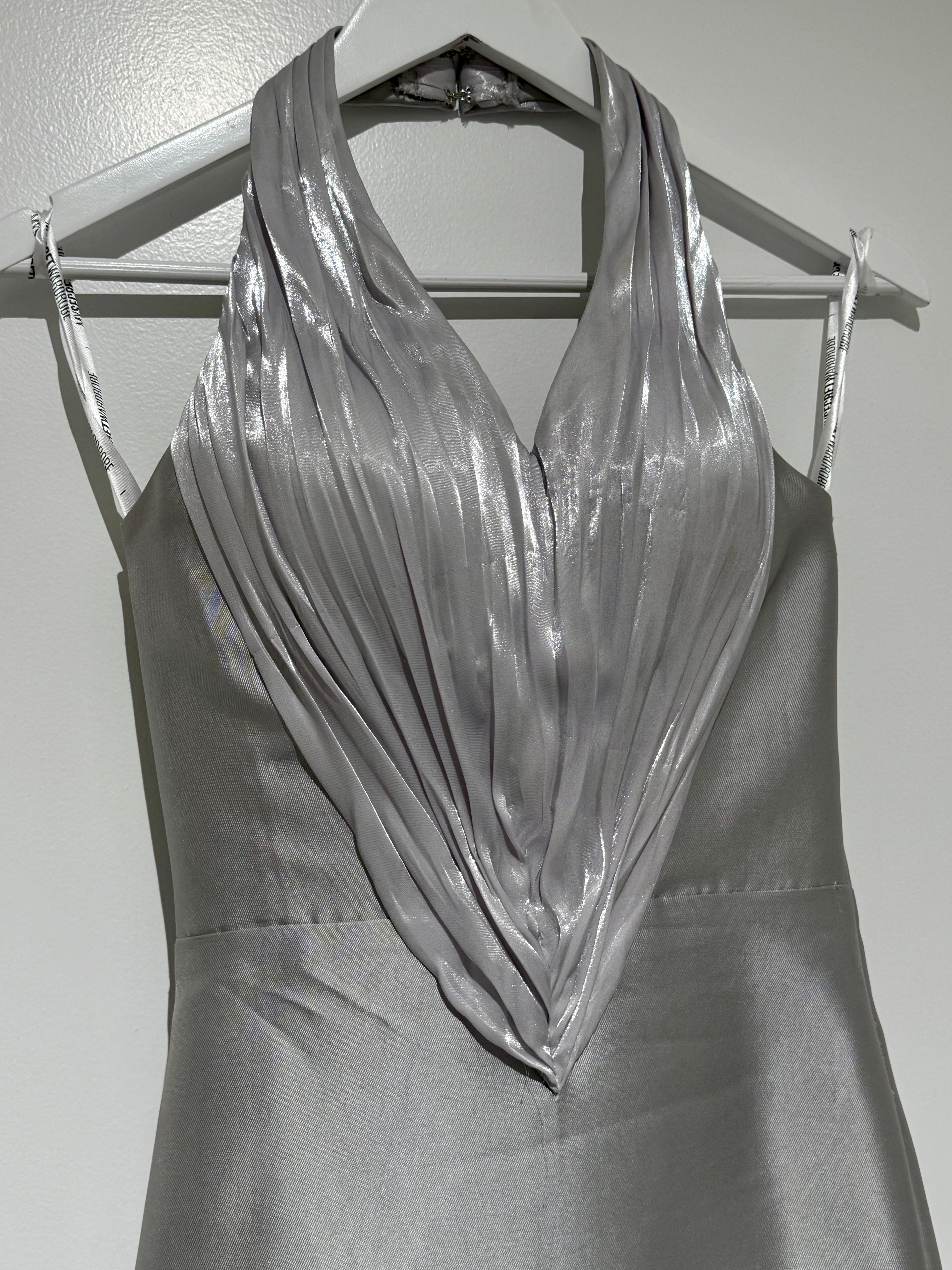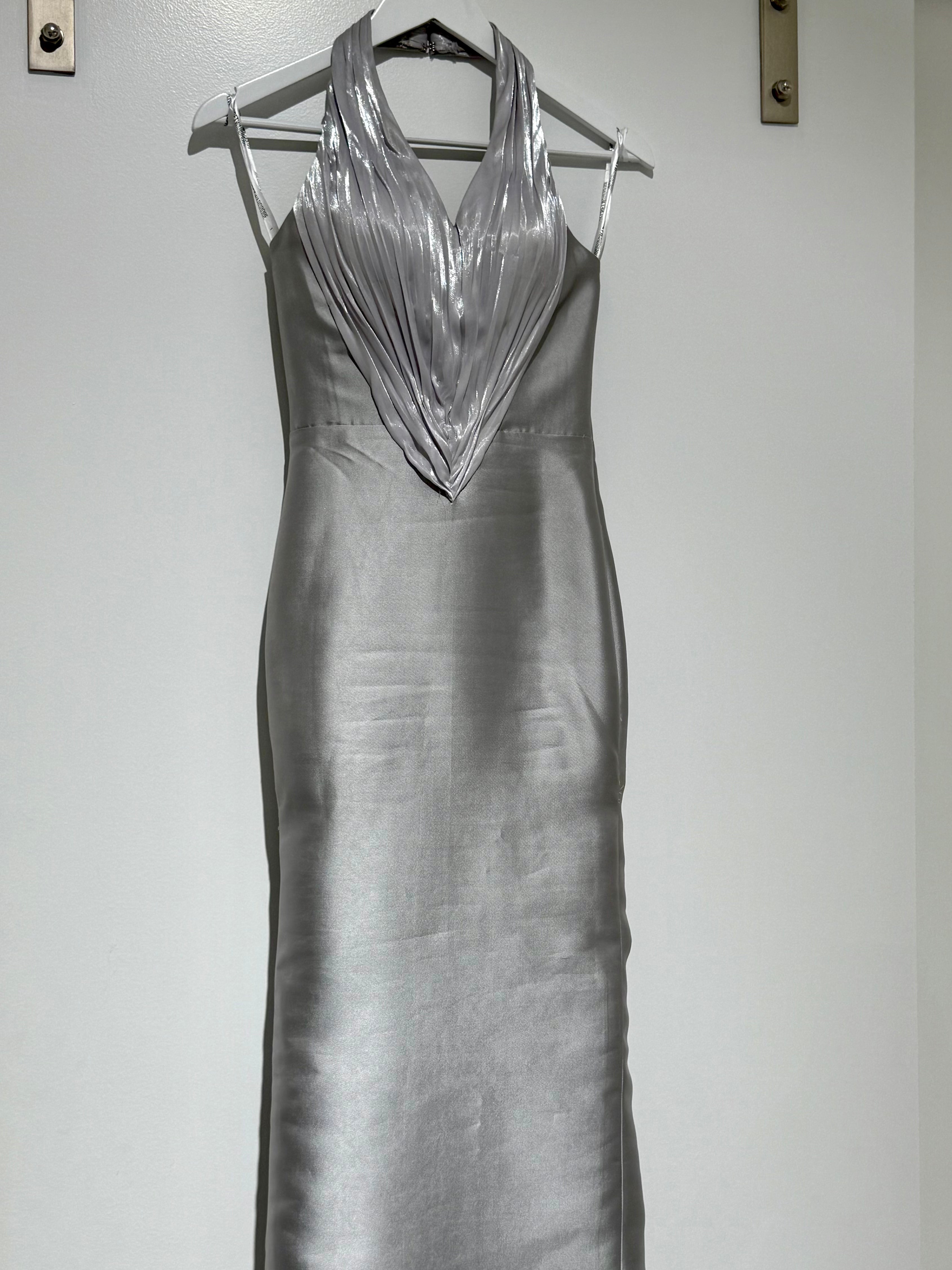 This stunning midi dress features a sheer organza chest panel and a graceful halter neckline, striking the perfect balance between allure and refinement. Crafted from luxurious satin silk, the skirt flows effortlessly to a midi length, offering a soft sheen and fluid movement with every step. Designed to captivate, this dress is ideal for evening soirées, romantic dinners, or any occasion that calls for understated glamour.
