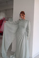 Graceful and striking, the Kalamantina gown features a fluid draped silhouette in a soft peach hue. Crafted from shimmering fabric with intricate ruching across the bodice, it includes an elegant neckpiece that cascades beautifully down the back — creating a timeless, ethereal effect. Perfect for evening occasions and special events.