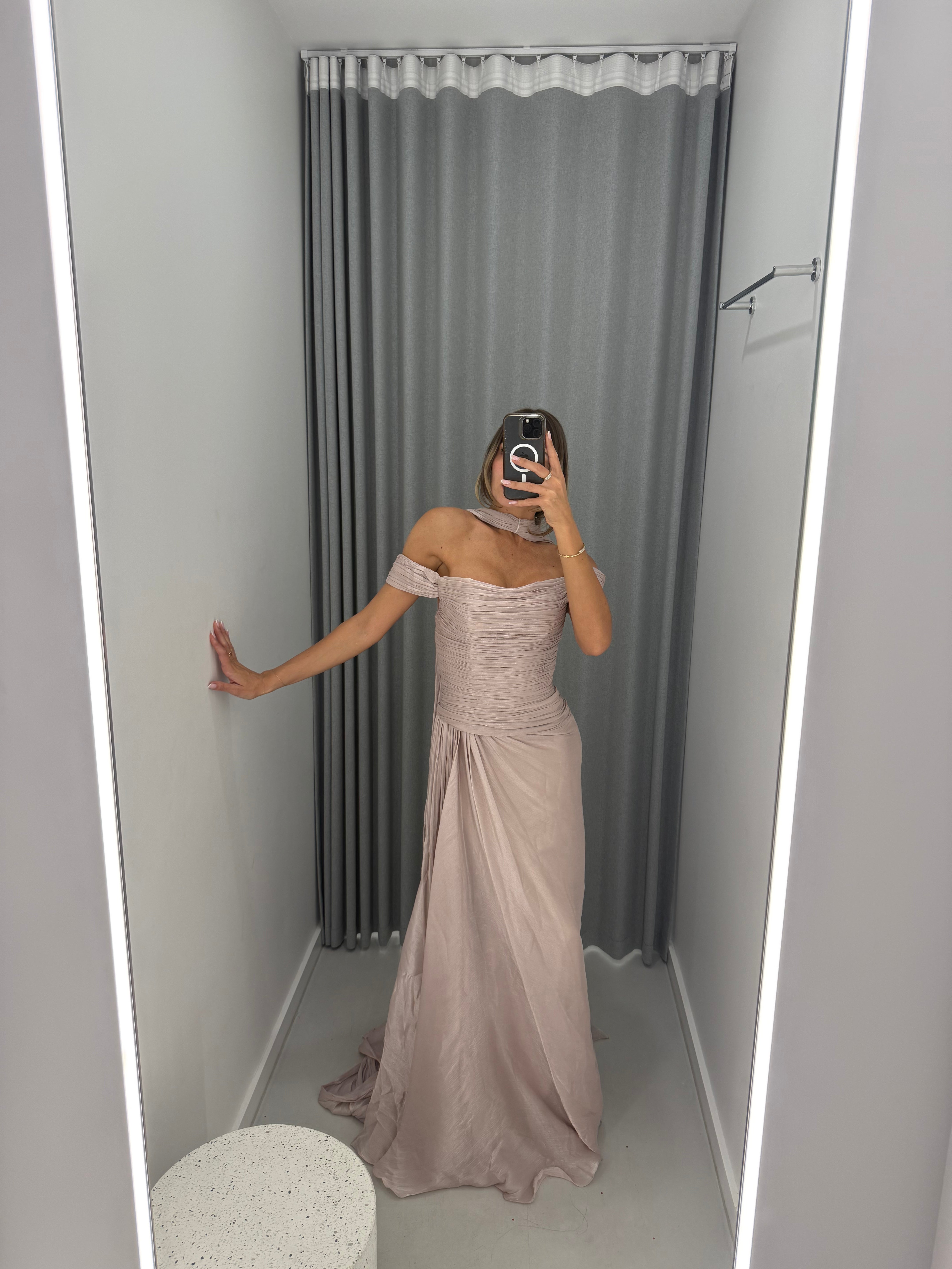 The Isla gown is the epitome of timeless elegance, designed to make a statement at any special occasion. Featuring an off-shoulder neckline with delicate ruching throughout the bodice, it beautifully flatters the figure while exuding effortless grace.