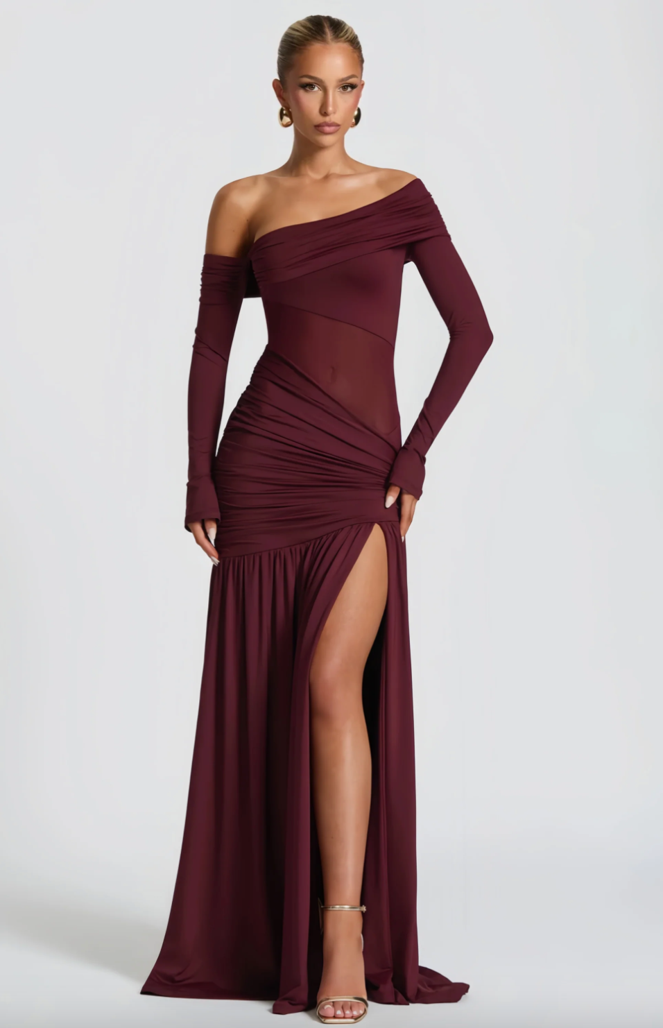 Embrace timeless elegance with the Anastasia Burgundy One-Shoulder Gathered Maxi Dress. Crafted from a luxurious blend of terylene fiber and spandex, this gown offers a graceful silhouette that flatters the figure. The asymmetrical one-shoulder neckline and long sleeves provide a sophisticated look, while the fitted waistline enhances the feminine shape. Gathered detailing adds texture and movement, complemented by a mesh panel and pleated accents that introduce a touch of modern flair. A high slit and semi-sheer elements add a hint of allure, making this dress perfect for formal events, evening soirées, or any occasion that calls for understated glamour. With its slip-on style and maxi length, the Anastasia dress combines classic design with contemporary sensibility, ensuring you stand out with poise and confidence.