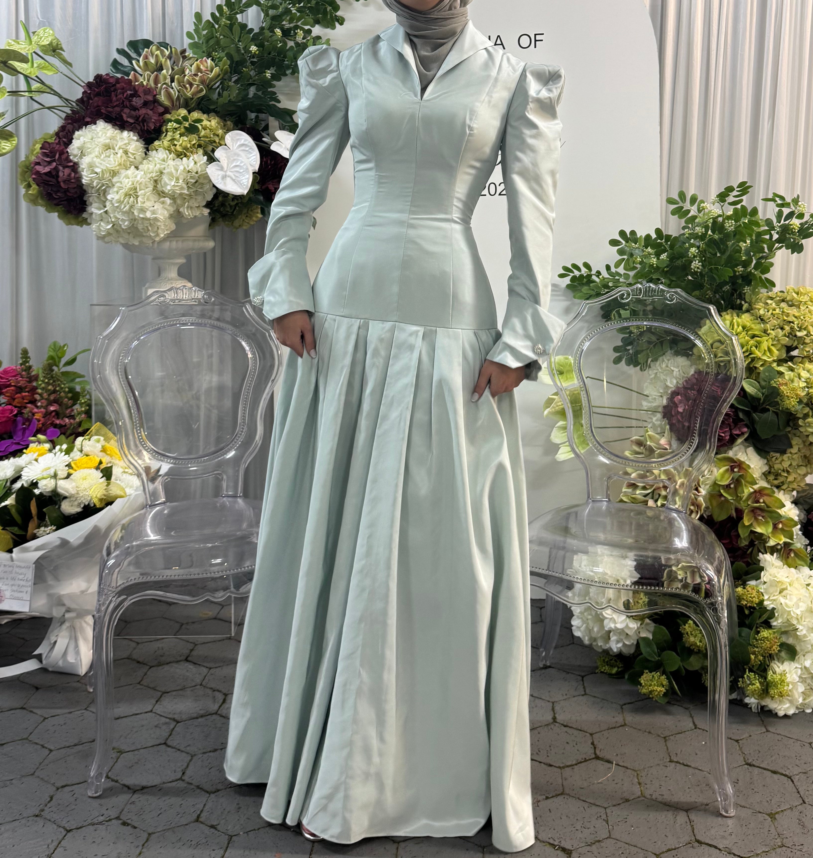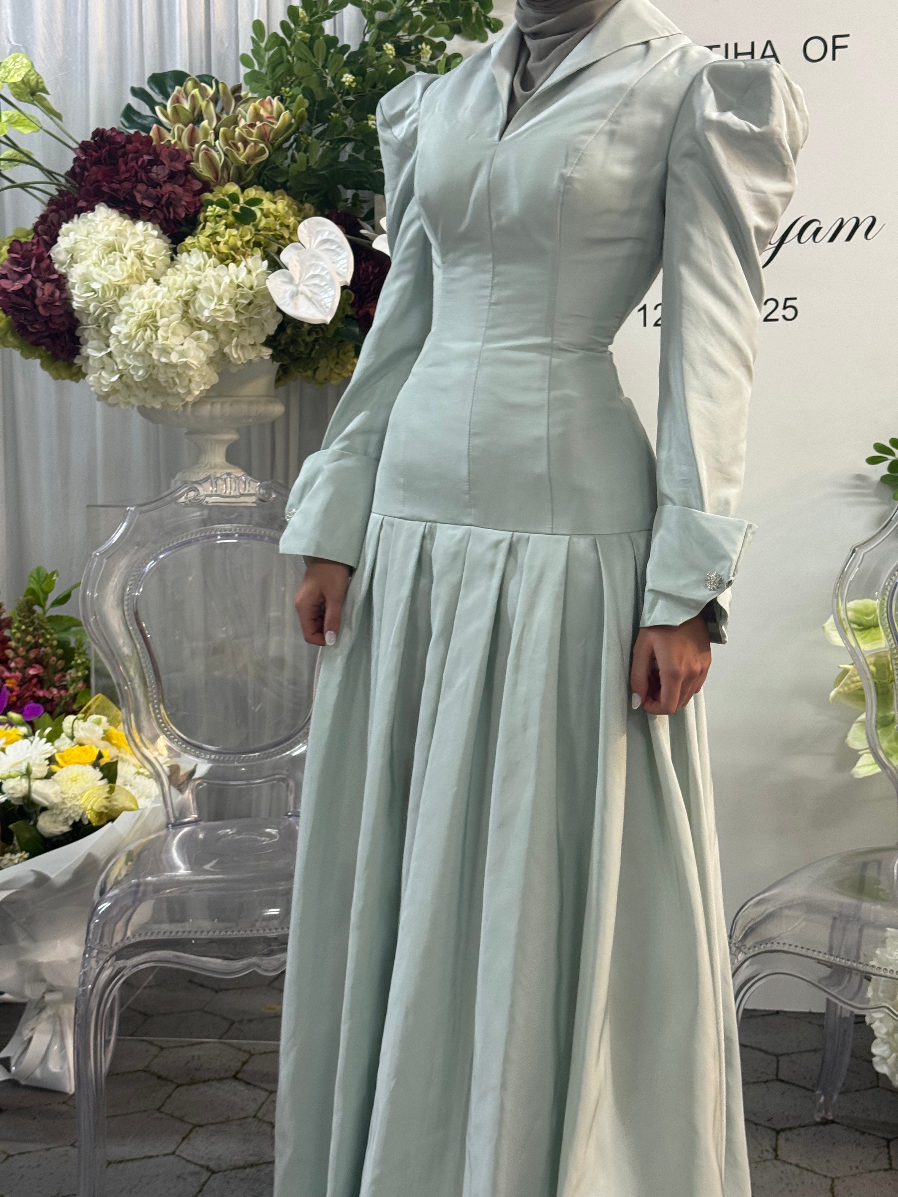 This exquisite gown blends structured elegance with soft, fluid movement. Designed with a sculpted bodice, subtle puffed shoulders, and refined cuff detailing, it offers a timeless silhouette that flatters effortlessly. The gathered skirt drapes gracefully, creating a look that is both modest and luxuriously feminine. Perfect for special occasions, this piece embodies sophistication, confidence, and understated beauty.