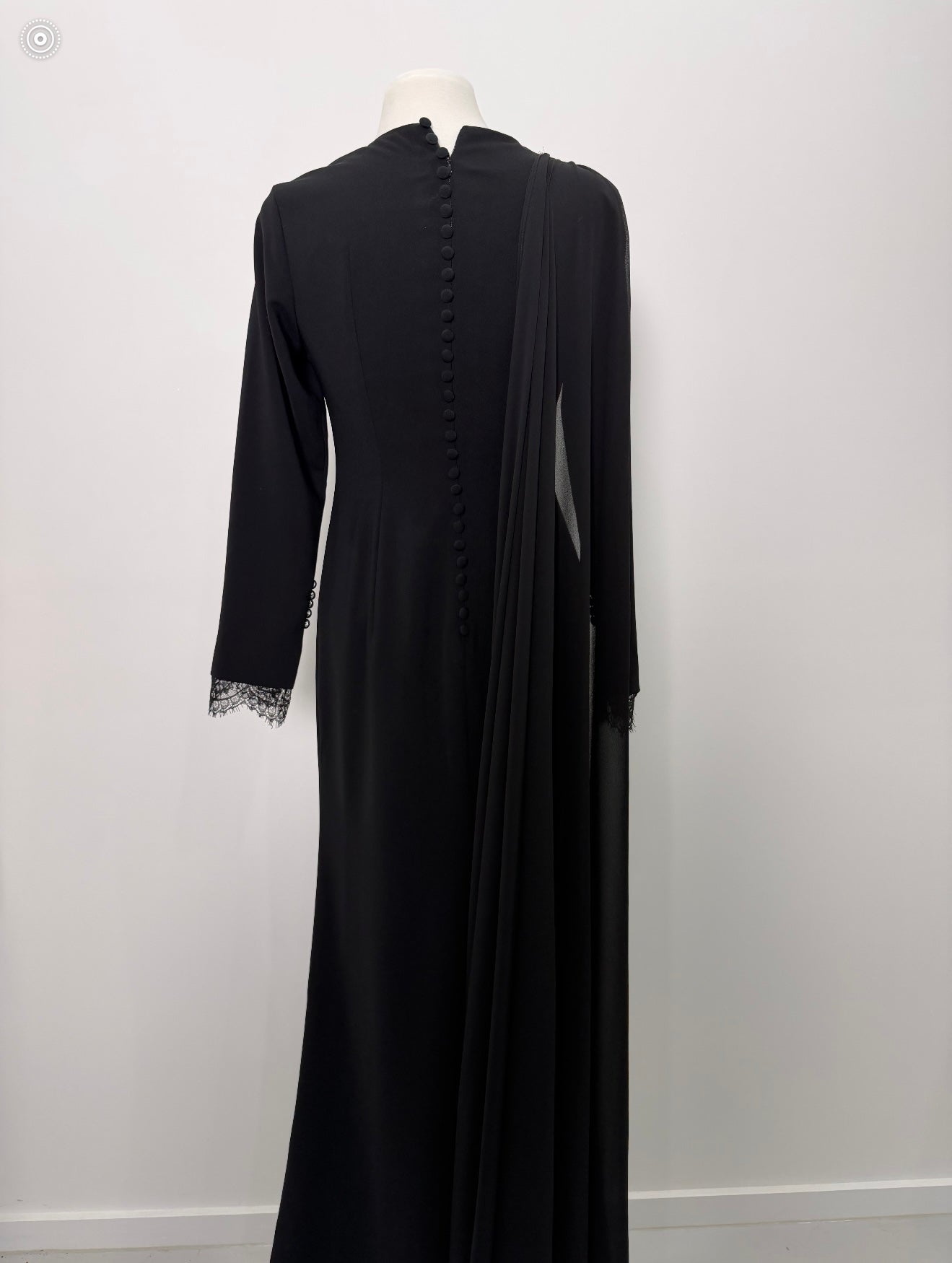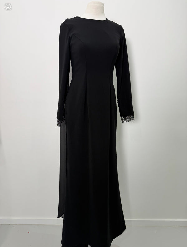 Timeless and commanding, this black maxi dress features full-length sleeves with delicate lace detailing at the wrists and a soft, a shoulder piece for added drama. Crafted for elegance in motion, it’s the perfect balance of structure and grace — ideal for evening wear that speaks volumes without saying a word.