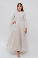 The dress is adorned with intricate embroidery throughout, creating a luxurious and eye-catching effect. The embroidery is thoughtfully placed to enhance the silhouette and draw attention to your best features. The addition of feathers adds a whimsical and ethereal touch, elevating the overall look of the dress.