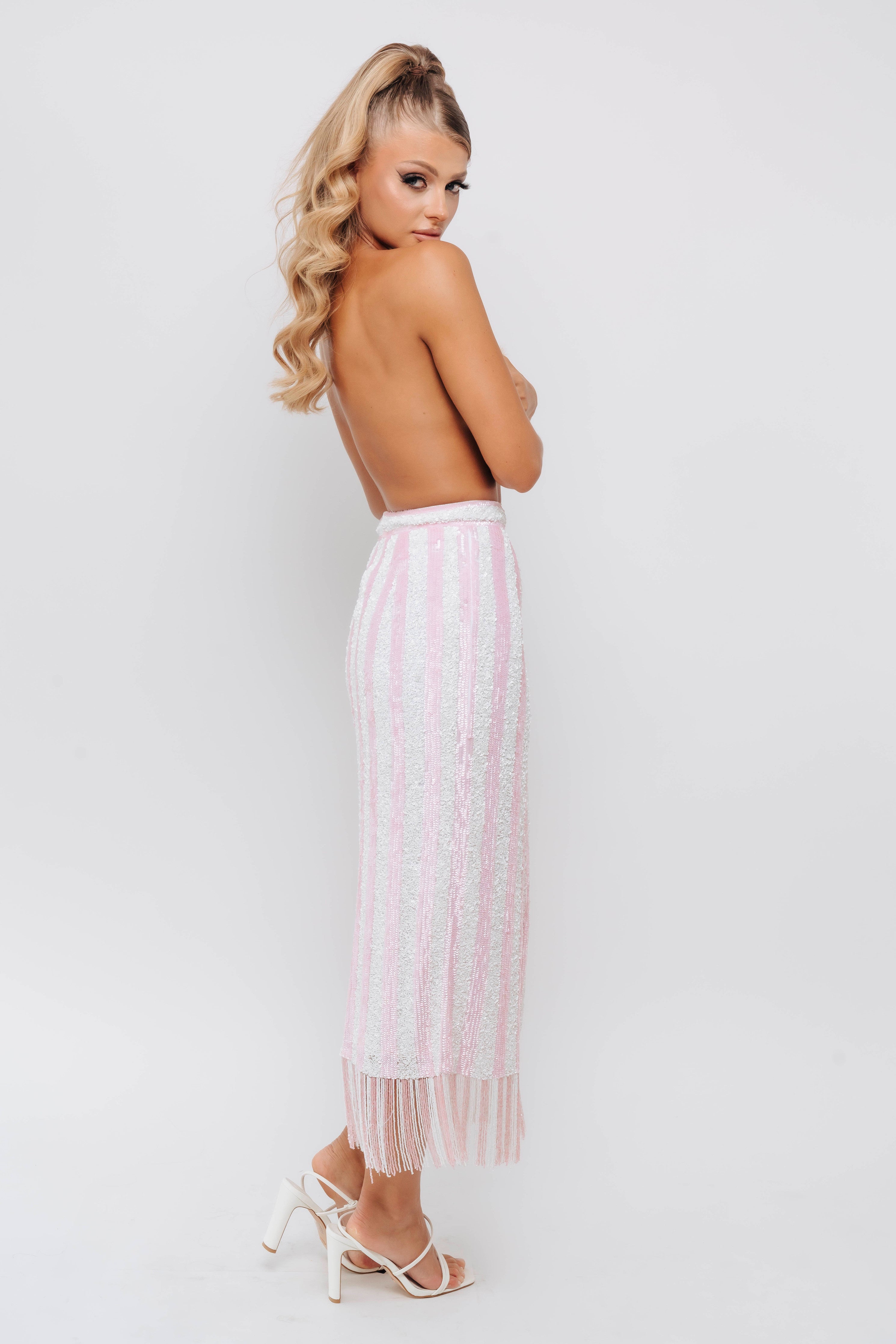 A blend of elegance and playfulness. With alluring leg slits, graceful tassels, and a harmonious pink and white palette, this skirt adds a touch of charm to any occasion. Crafted for comfort and style, it's your go-to choice for a breezy and captivating look.