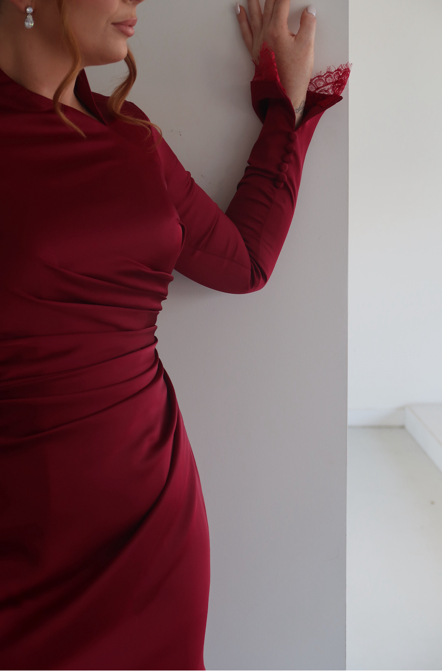 Timeless and effortlessly chic, The Shay Gown is designed to make an impact. Crafted from soft, lightweight satin with full lining, this long-sleeve beauty drapes gracefully over the body. Delicate gathering on the bodice enhances the silhouette, while a touch of lace detailing on the sleeves adds a hint of romance.