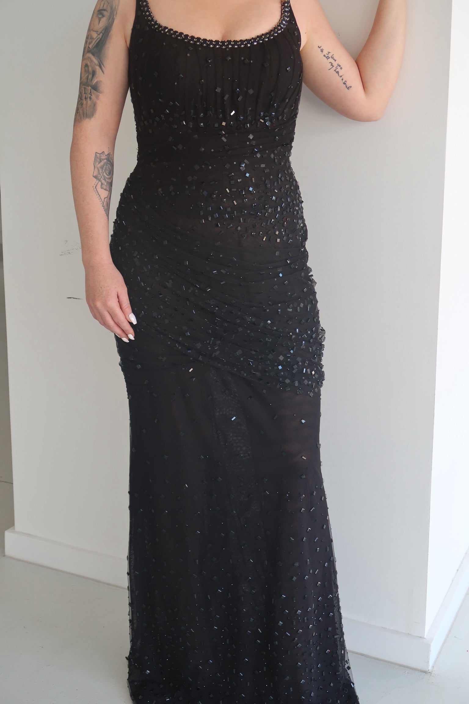 This stunning maxi dress features a delicate light trail mesh woven throughout, creating a soft, ethereal glow with every step. Beaded details adorn the neckline and singlet straps, adding just the right touch of sparkle. The fabric’s landscape-inspired pattern elegantly contours along the ribs, hips, and thighs, enhancing your silhouette with fluid movement. Perfect for evenings that call for refined glamour and effortless sophistication.