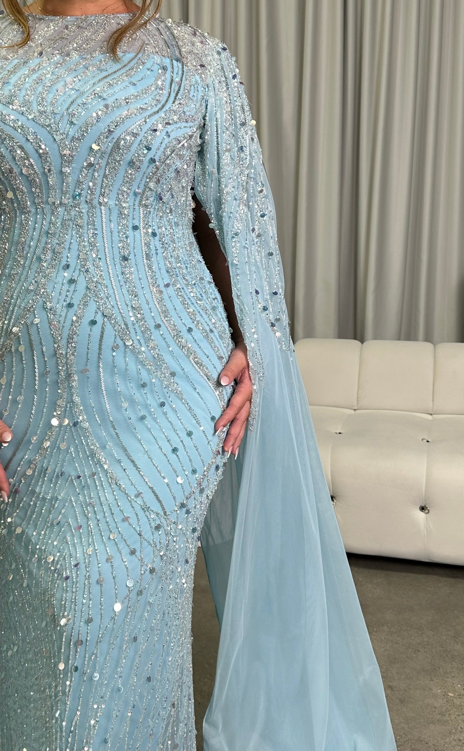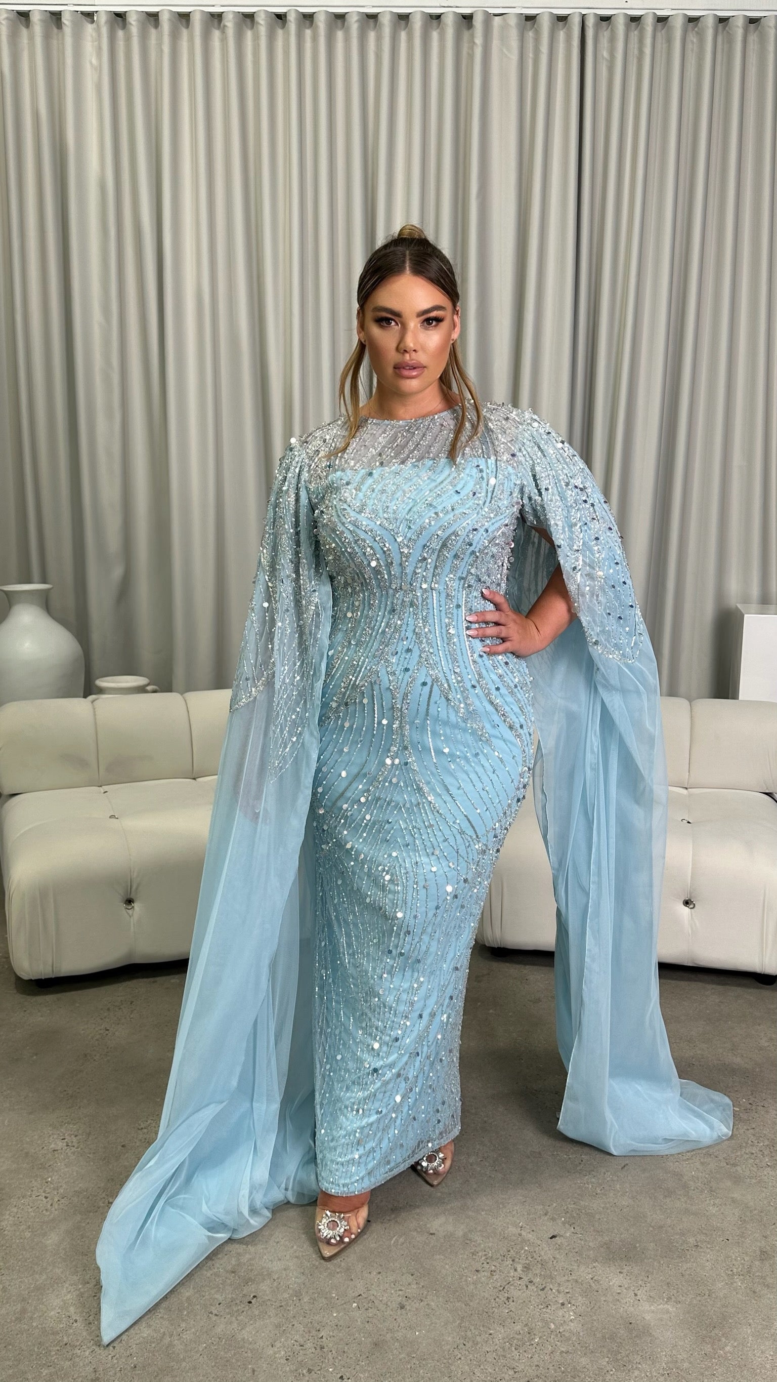 Step into timeless elegance with our breathtaking dress, available for hire at My Secret Wardrobe. This enchanting gown features long sleeves that gracefully cascade to the ground, in a captivating shade of blue that evokes sophistication and charm. Adorned with exquisite silver beadwork and finished with sweet heart lining and delicate buttons on the back, this dress is sure to make you feel like royalty at your next event.