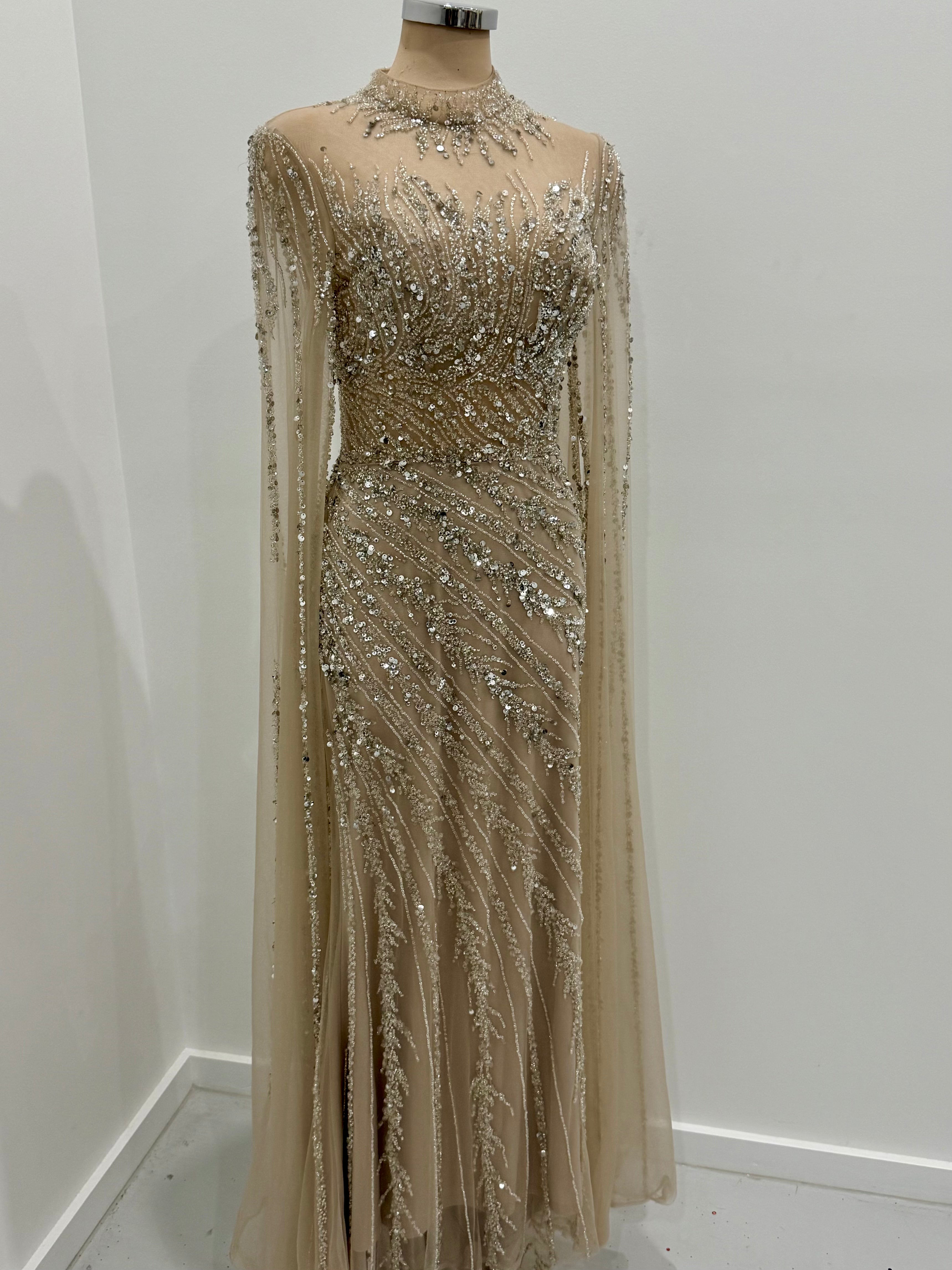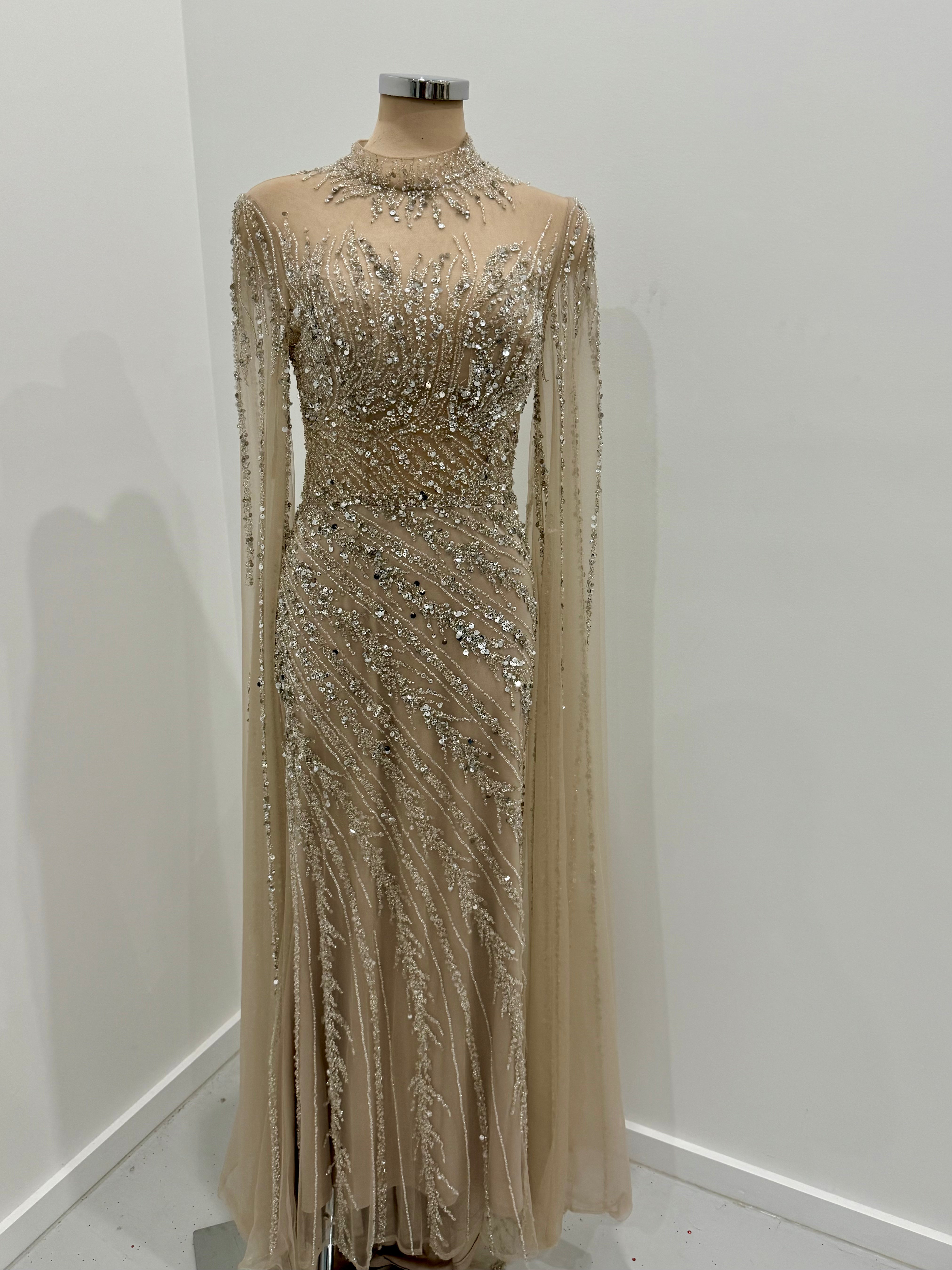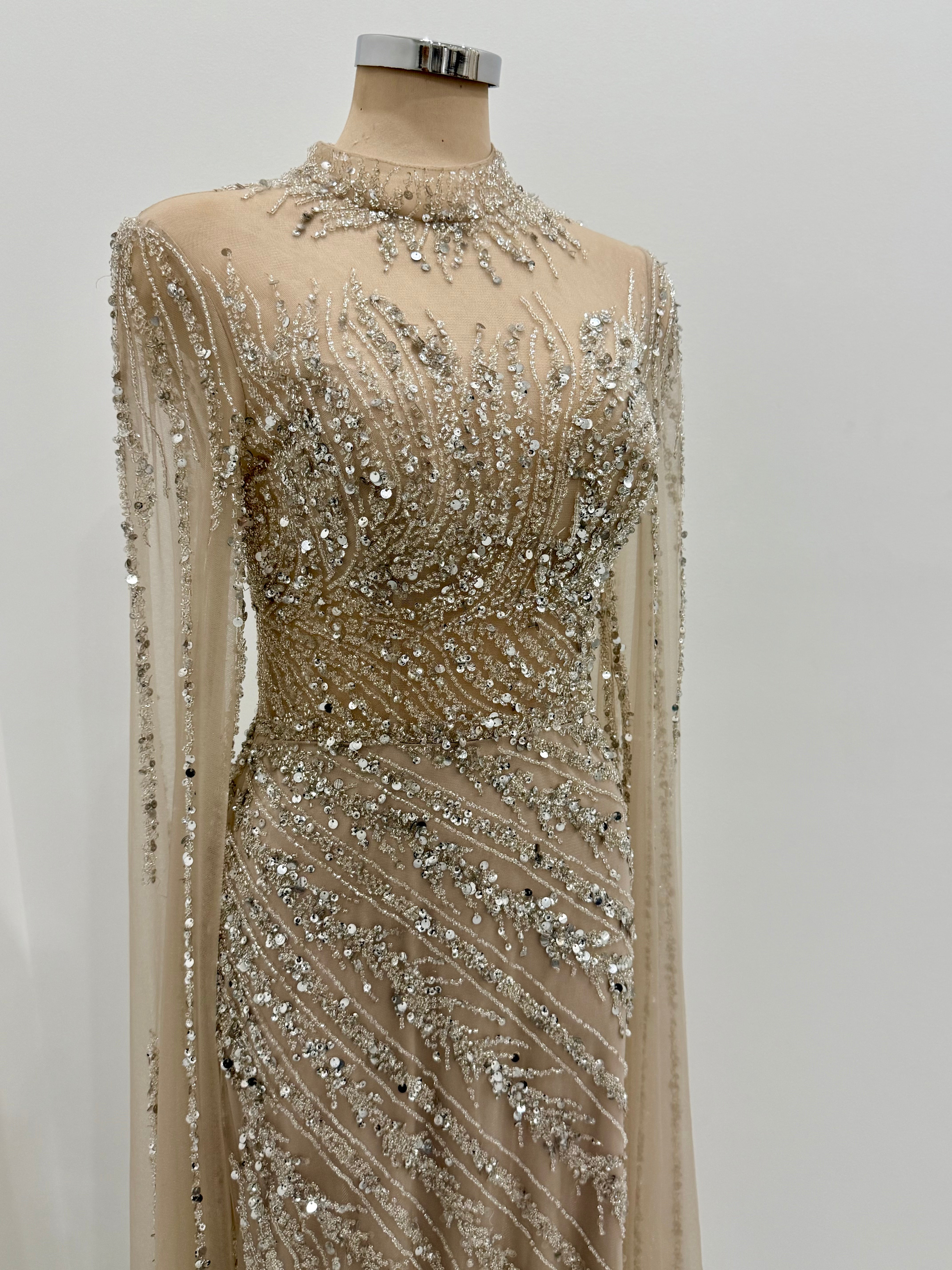 Ethereal elegance defines this High Neck Sheer Gown in a dreamy mauve-grey hue. The sheer bodice features a built-in shelf bra for confident coverage, while the high neckline and floor-grazing sheer sleeves are delicately embellished with subtle beading for a refined sparkle. Beading continues along the sheer waist and neckline, adding texture and visual interest. The full-length maxi skirt flows gracefully, adorned with shimmering beadwork throughout for a softly radiant finish. Perfect for formal evenings, galas, or statement occasions, this gown blends modern modesty with timeless sophistication.