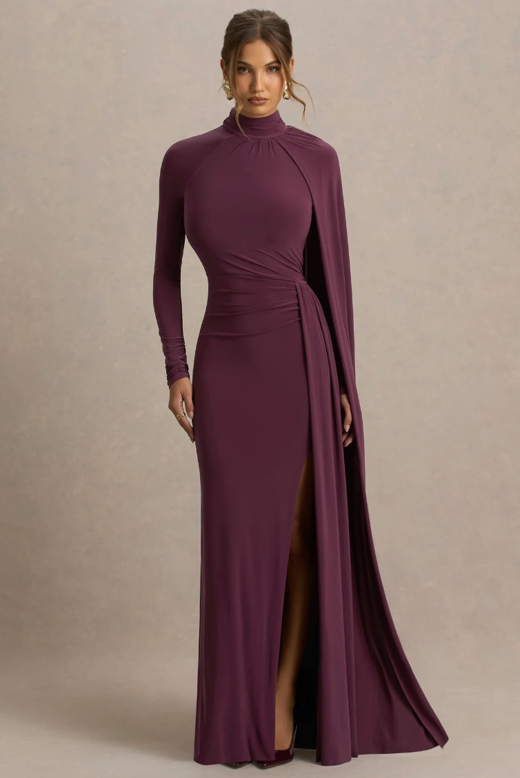 Own the spotlight in Anticipation, a sultry yet sophisticated showstopper made for after dark allure. Designed in a deep burgundy hue of our premium stretch jersey, this maxi dress is designed to sculpt and flatter. Featuring a sleek high neckline and long sleeves, that add utter elegance, and ruched detailing to enhance your silhouette. The front high split adds the right amount of drama, ensuring you exude confidence. Whether its a black tie event or a romantic date night, Anticipation ensures all eyes on you.