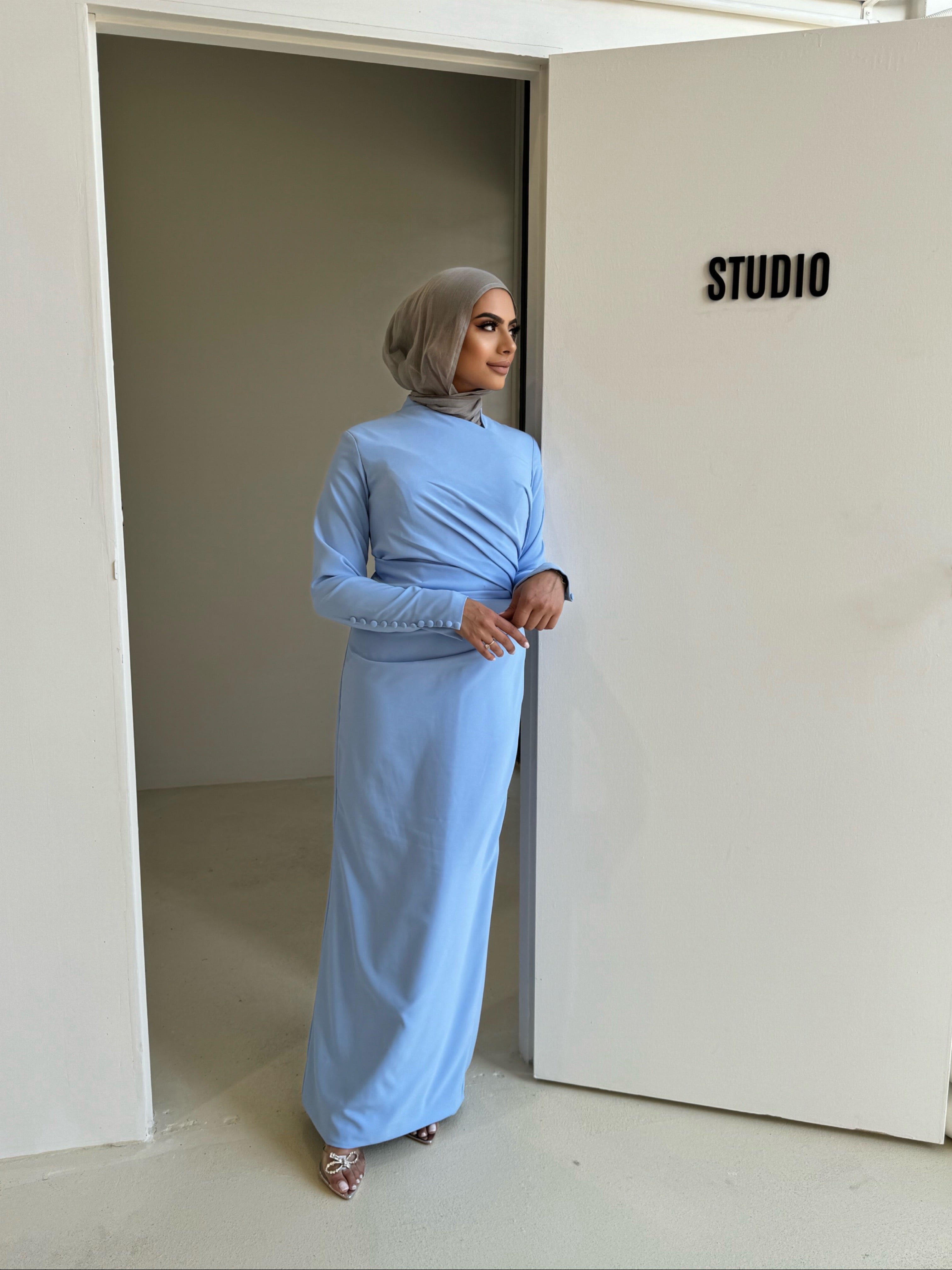 Discover the elegance of a custom-made dress from My Secret Wardrobe, now available for rental. This exquisite baby blue dress boasts long sleeves and a graceful gathered design that gracefully sweeps the floor, offering a modest and timeless look for your special occasion.